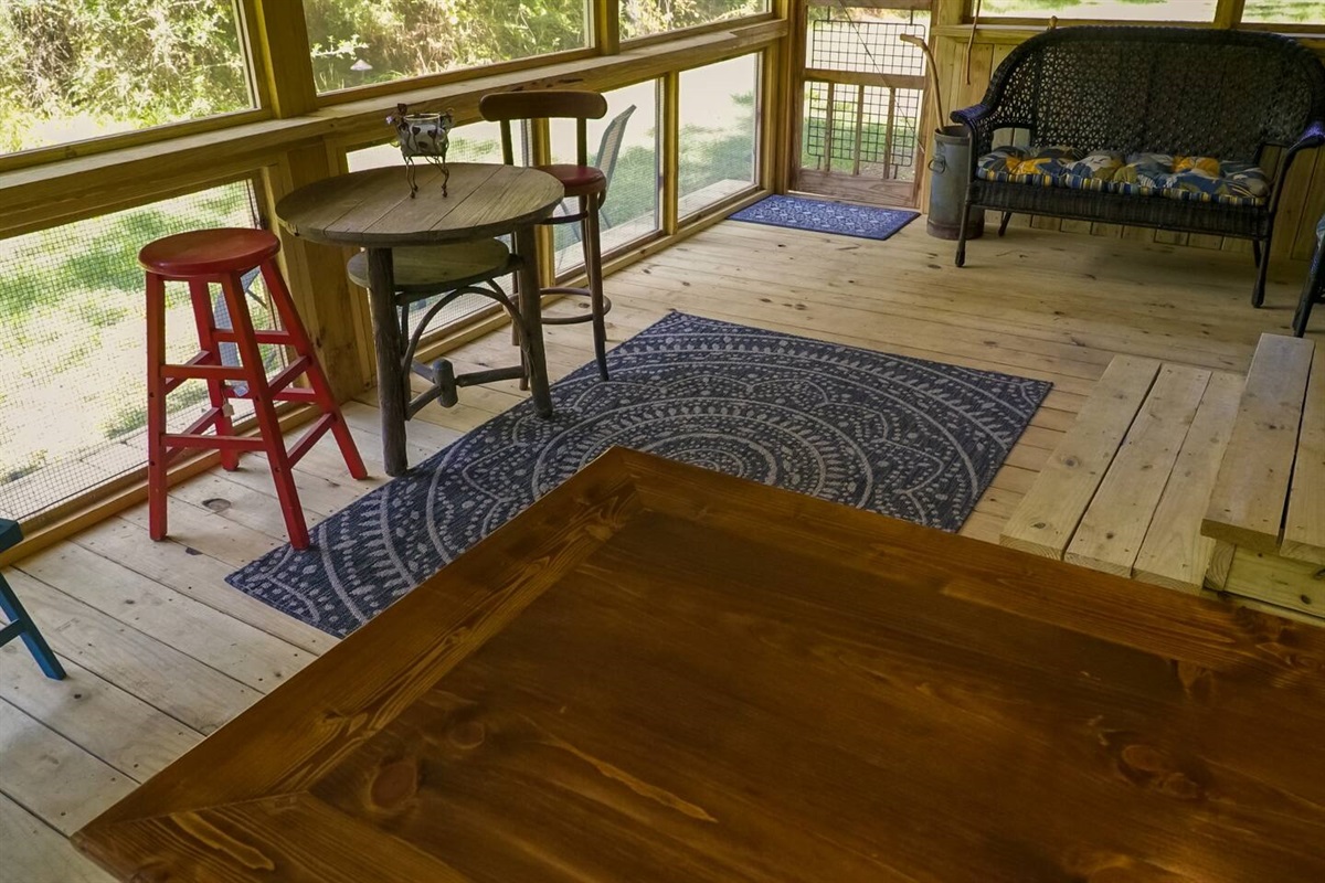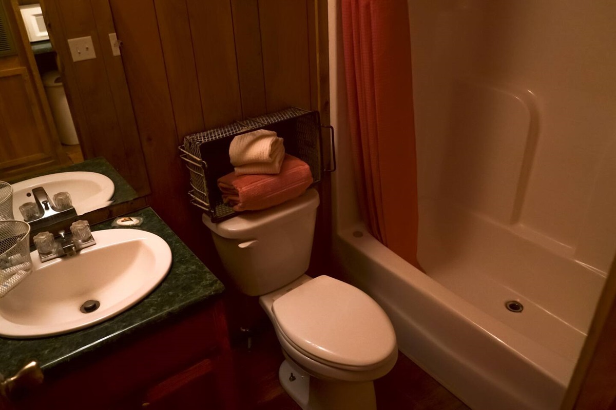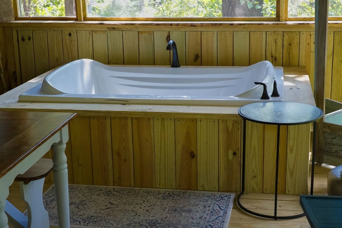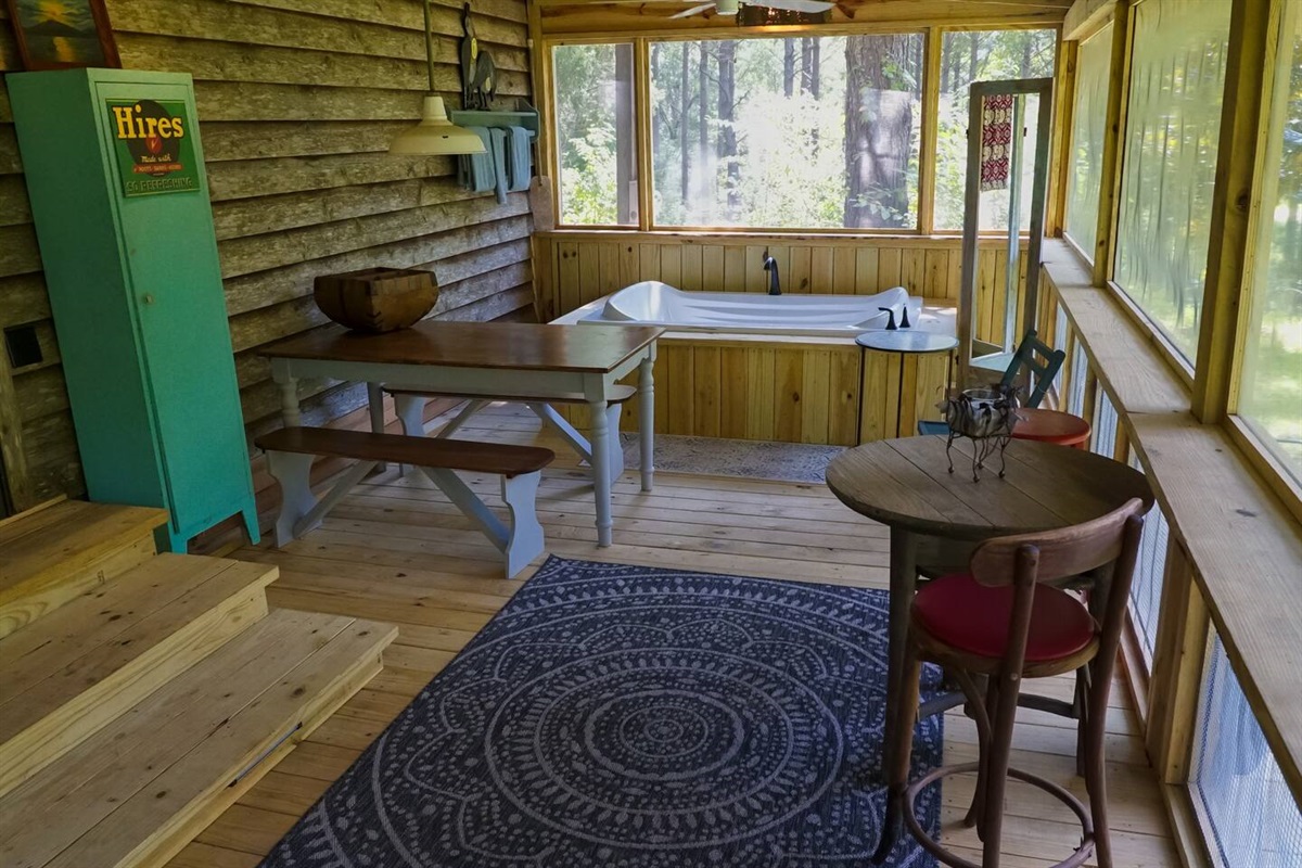 Come relax in the jetted tub on screen porch, grill out on our patio, or spend your night outside by a fire! Our cabin has 1 double bed and two single bunk beds that fold down from the wall. The cabin includes a kitchenette with all the essential amenities, a bathroom with a shower, our favorite spot is the large screened in deck that has lots of room to hang out and includes a large tub with jets! This tub is a two person size tub and we have hot water, it just does not hold the heat like a spa tub! Great for cooling off in the summer and warming up in the winter.